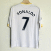 The *MANCHESTER UNITED 2006-07 AWAY KIT* features *Cristiano Ronaldo* in a striking *white and navy blue* design with a unique *five-sleeve* style. With Ronaldo’s *name and number 7*, it’s a classic jersey from his rise to stardom, ideal for fans and collectors.